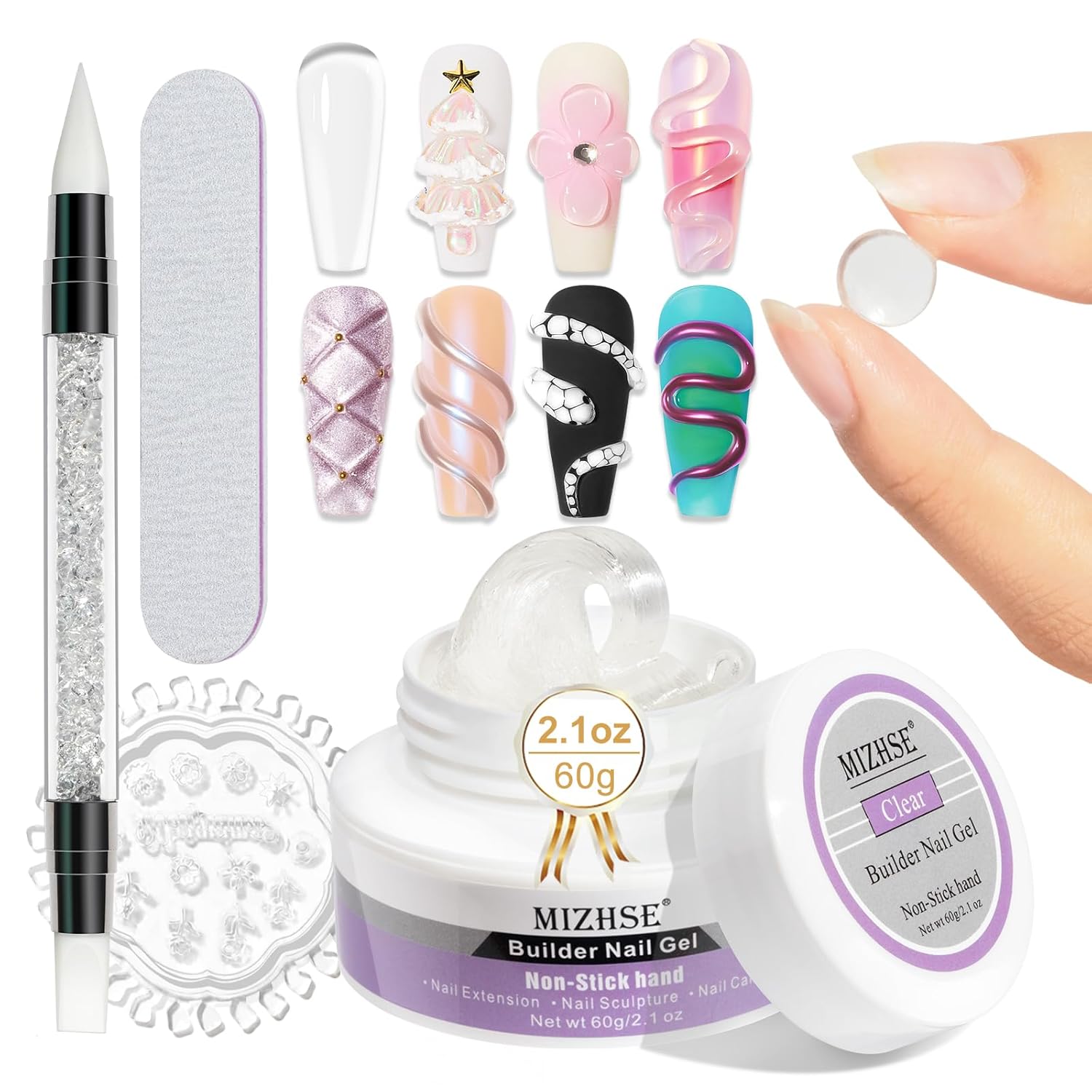 MIZHSE Solid Builder Gel for Nails, 60g Large Capacity Clear Hard Gel for Nails 3D Sculpting Gel Non-Sticky Hand Carving Gel UV LED Nail Extension Gel with 3D Silicone Mold Nail Art Salon Home DIY
