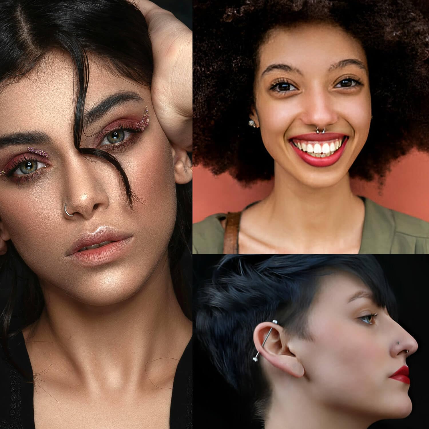 3pcs C shaped nose ring(20G); 9pcs nose screw studs(20G); 3pcs belly button ring (14G); 5pcs horseshoe nose ring (16G); 5pcs clicker nose ring (16G); 5 closed nose rings (16G); 6pcs industrial barbell (16G); 3pcs eyebrow ring (16G); 6pcs lip stud (16G); 3pcs tongue stud (16G); 3pcs high nostril piercing stud (16G);2pcs piercing clamps;15pcs of piercing needles(12gauge x 5, 14gauge x 5, 16gauge x 5);2Pcs black latex gloves;10pcs alcohol pads;
