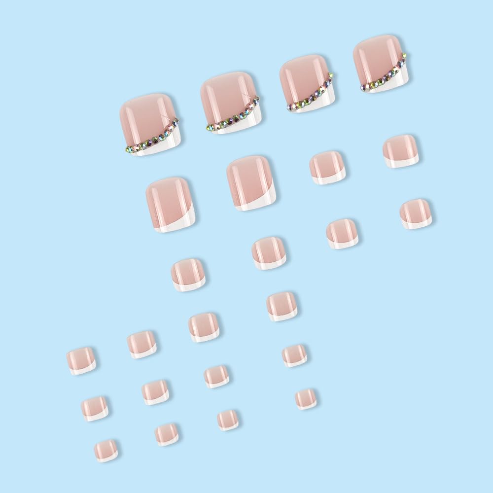 Pink Press on Toe Nails French Tip Fake Toenails with Rhinestone Designs Cute False Toe Nails Medium Glue on Toenails Square Stick on Toe Nails Glossy Acrylic Toenails Full Cover Artificial Toenails