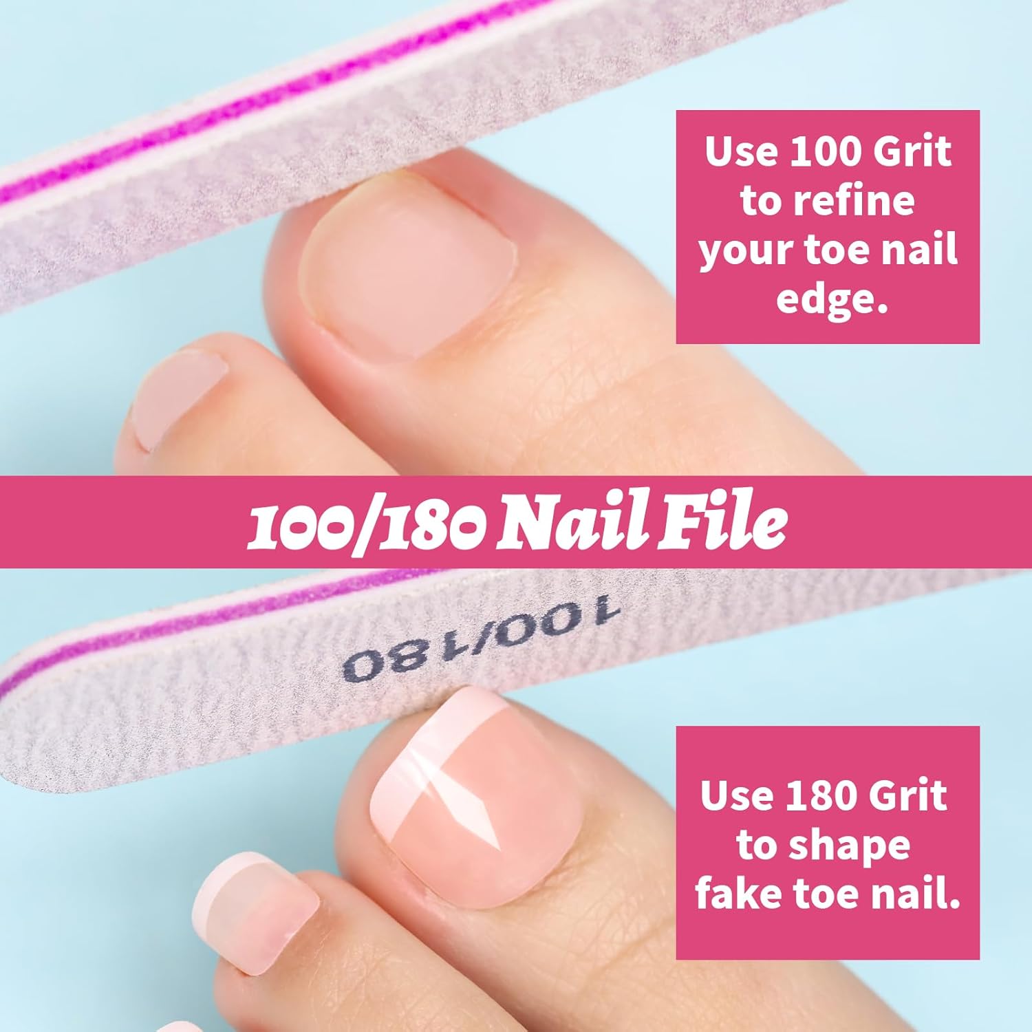 Useful Nail File with 100/180 Print: This nail file is double side, printed side is fine grit-180 grit, suitable for shaping fake toe nail tip or natural nails, blank side is rough grit-100 grit, you can use it to trim your nails or remove top coat of polish