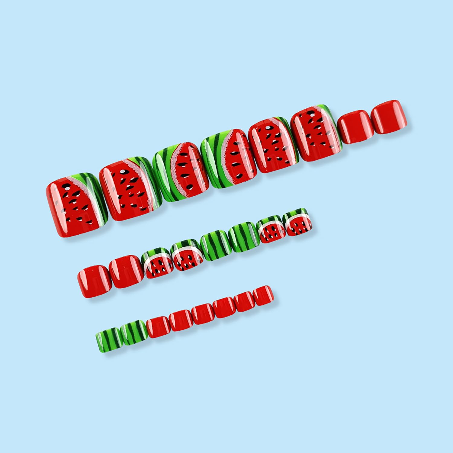Watermelon Press on Toenails Short Square False Nail Red & Green Full Cover Design Summer Cute Fake Toe Nails